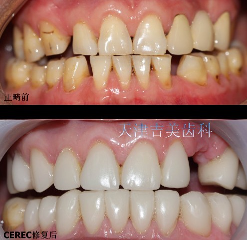 病历四:上图为修复前,牙齿稀松,颜色不正。下图为cerec贴面修复后,改变了形态和颜色,形象生动,玉质感,患者非常满意。